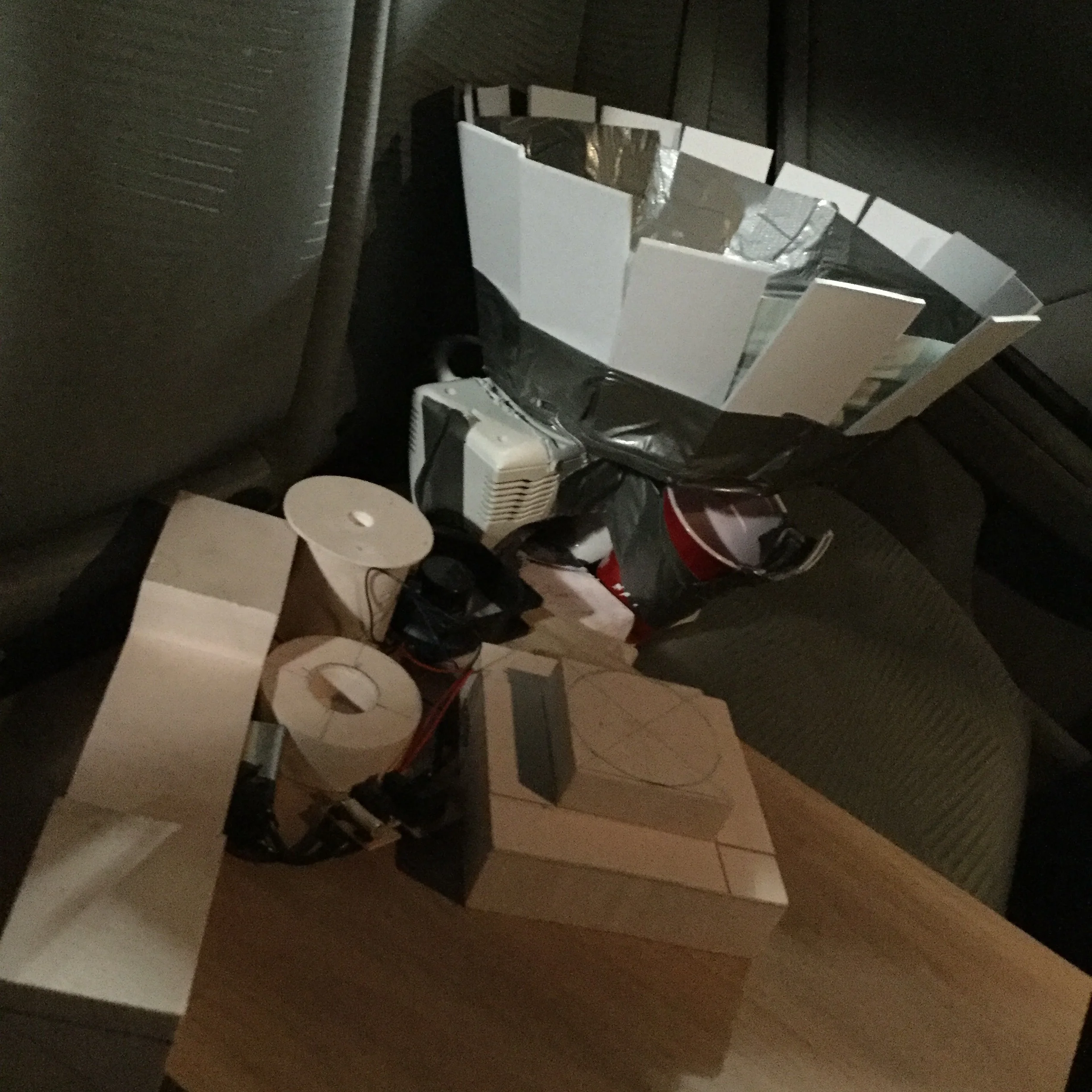 I used found objects and materials for the lower-class centrifuge, then weathered with acrylic paint. For the upper-class centrifuge, I used REN foam processed by the vertical milling machine & metal lathe, as well as stained walnut & a wired switch system.